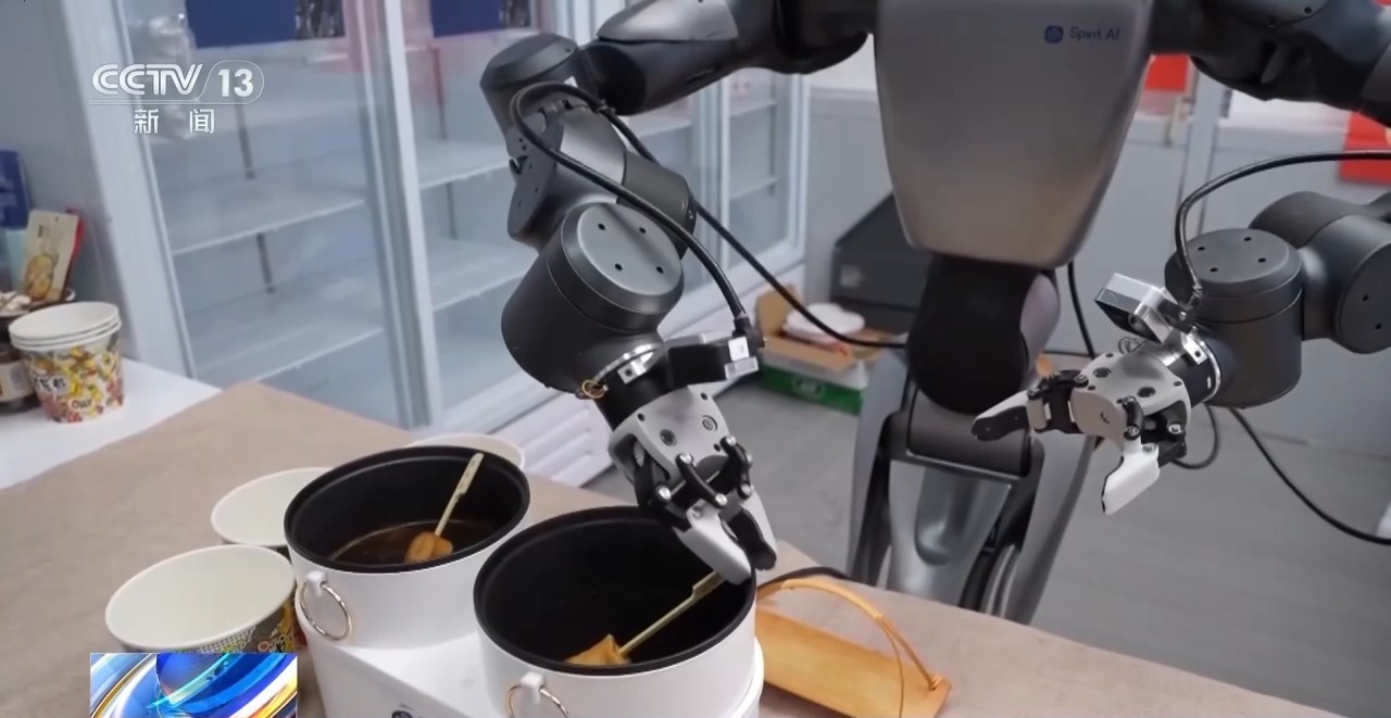穿上机器人的模仿学习设备,控制这个机器人手部一模一样的夹爪,我们就可以完成整套涮火锅的人类示范教学。看起来简单的动作,但其实位置、角度、力度甚至弯腰屈膝的弧度都得精准拿捏。而训练有素的数采员,顺利完成了一系列涮火锅的采集动作。一条条反反复复模拟涮火锅过程的视频被录制出来,一共汇总了共计八个小时的有效数据。工程师将采集过来的真机数据投喂给机器人基座大模型后,机器人就初步具备了行为的执行能力,通过这些精准的数据训练,很快机器人就上手了。