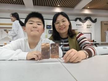 理论讲解后,最受期待的动手环节正式开始。在志愿者的指导下,孩子们和家长一起设计图案、涂抹溶液、观察反应。当原本普通的铜板逐渐显现出精美的金属图案时,现场响起阵阵惊叹。“原来化学反应这么神奇!我画的星星真的‘亮’起来了!”一位小朋友兴奋地举起自己的作品。家长们也表示,这种“游戏+实践”的方式,让孩子在玩中学,不仅掌握了科学知识,更激发了探索兴趣。